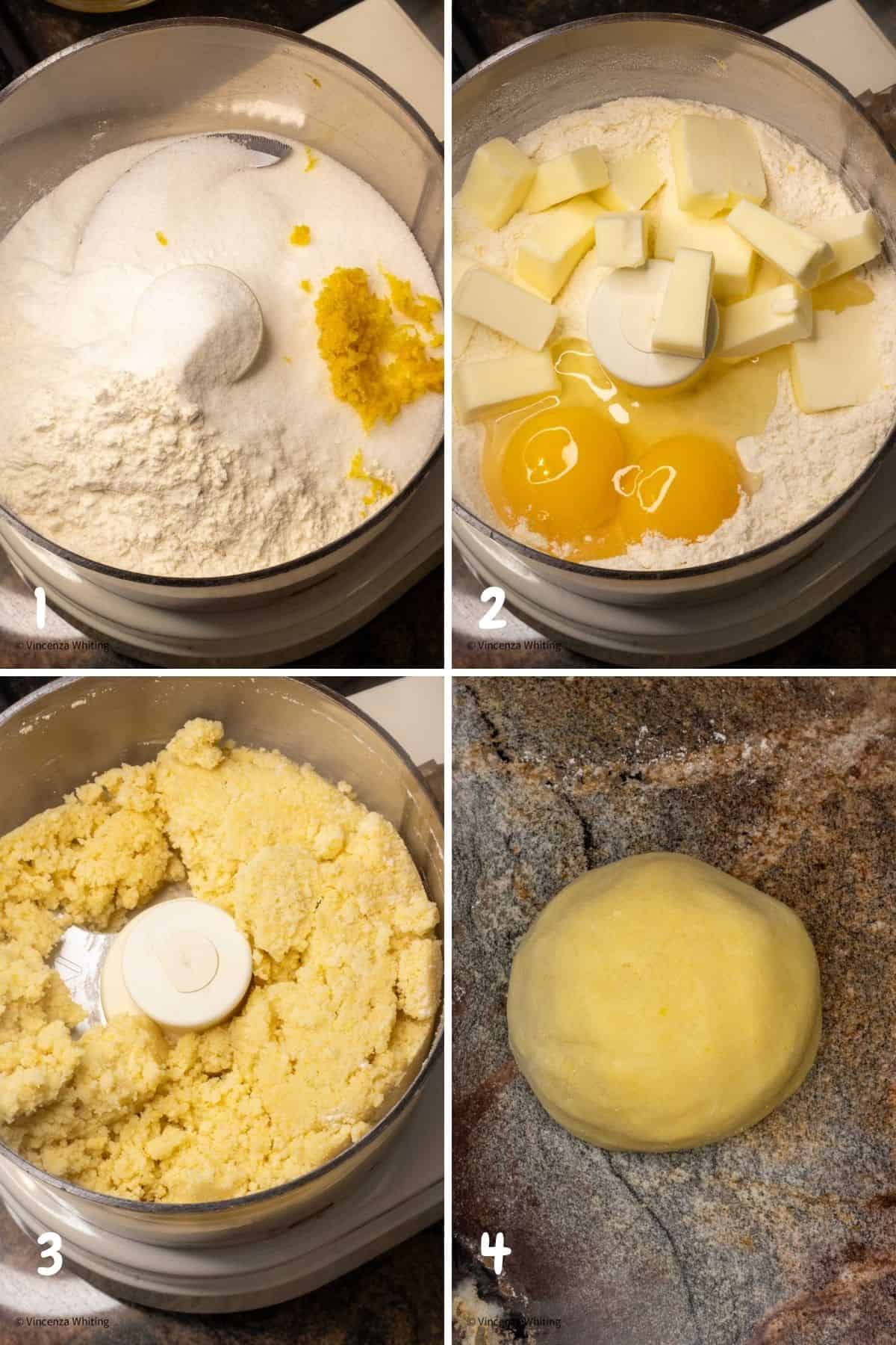 - Add the eggs and butter to the flour mixture and pulse until a dough forms. This may take a minute or two. Pour the dough out onto a floured surface and knead it a few times to form a ball. Flatten the ball into a disc and wrap it in plastic wrap. Refrigerate the dough for at least 30 minutes.