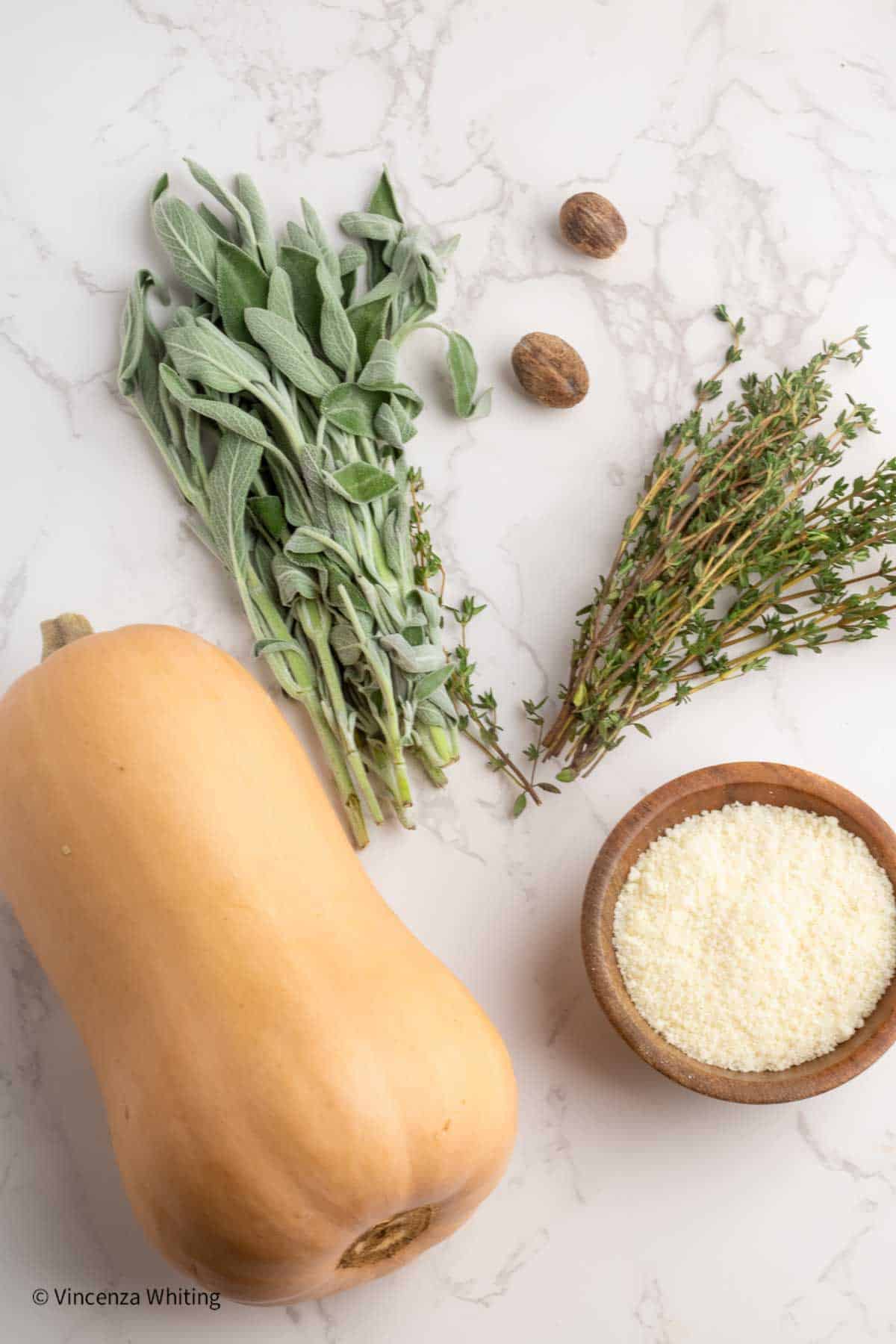 - Combine the butternut squash, grated cheese, thyme, sage, and nutmeg in the bowl of a food processor