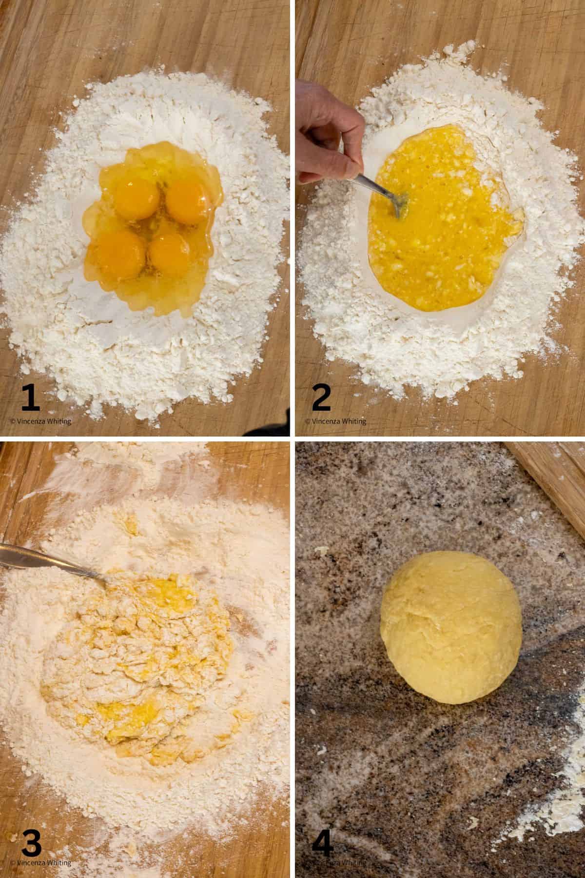 - Using a fork mix the eggs breaking them up and stirring in a little of the flour from the edges of the well. Continue stirring the eggs and pulling in the flour a little at a time until a shaggy ball of dough starts to form.